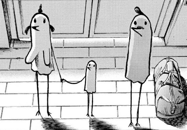 • Le personnage principal est représenté sous la forme d’un oiseau schématique, device graphique voulu par Asano pour faciliter l’identification du lecteur.