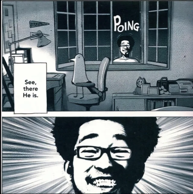Il y a d’abord ce « Dieu » que Punpun invoque via une formule apprise de son oncle. Une tête photographique avec une coiffure afro, qui apparaît quand Punpun a besoin de lui et dit souvent le contraire de ce que Punpun a envie d’entendre. C’est l’ami imaginaire d’un enfant qui ne croit plus vraiment en rien, matérialisé sous une forme absurde. Ce Dieu est drôle, dérangeant, et finalement assez désespérant quand on réalise à quel point Punpun s’y accroche.